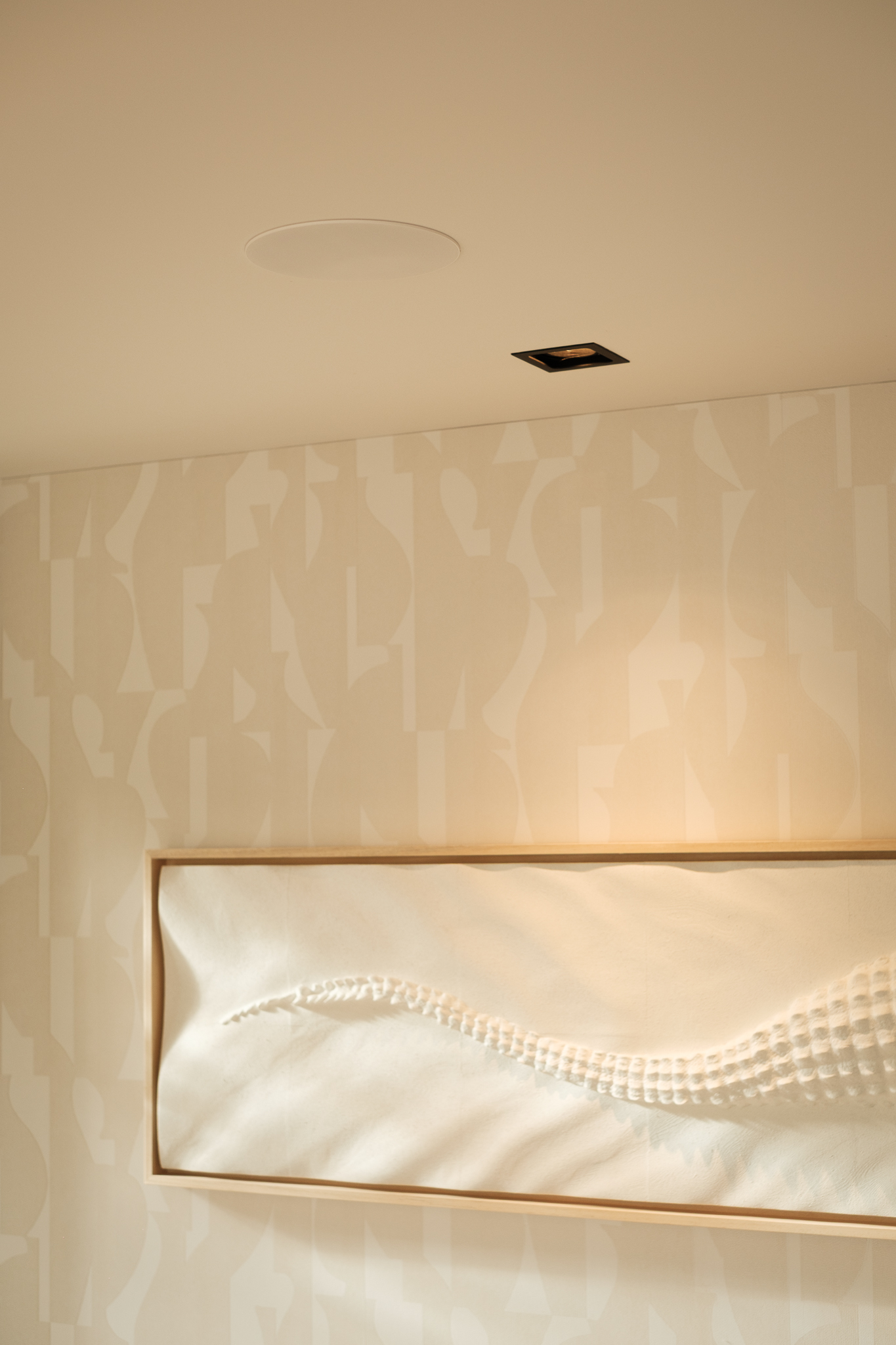 Het samenspel van Alabaster verlichting, Sonance audio en indirect licht maakt deze lounge tot een plek waar comfort, akoestiek en design elkaar versterken.