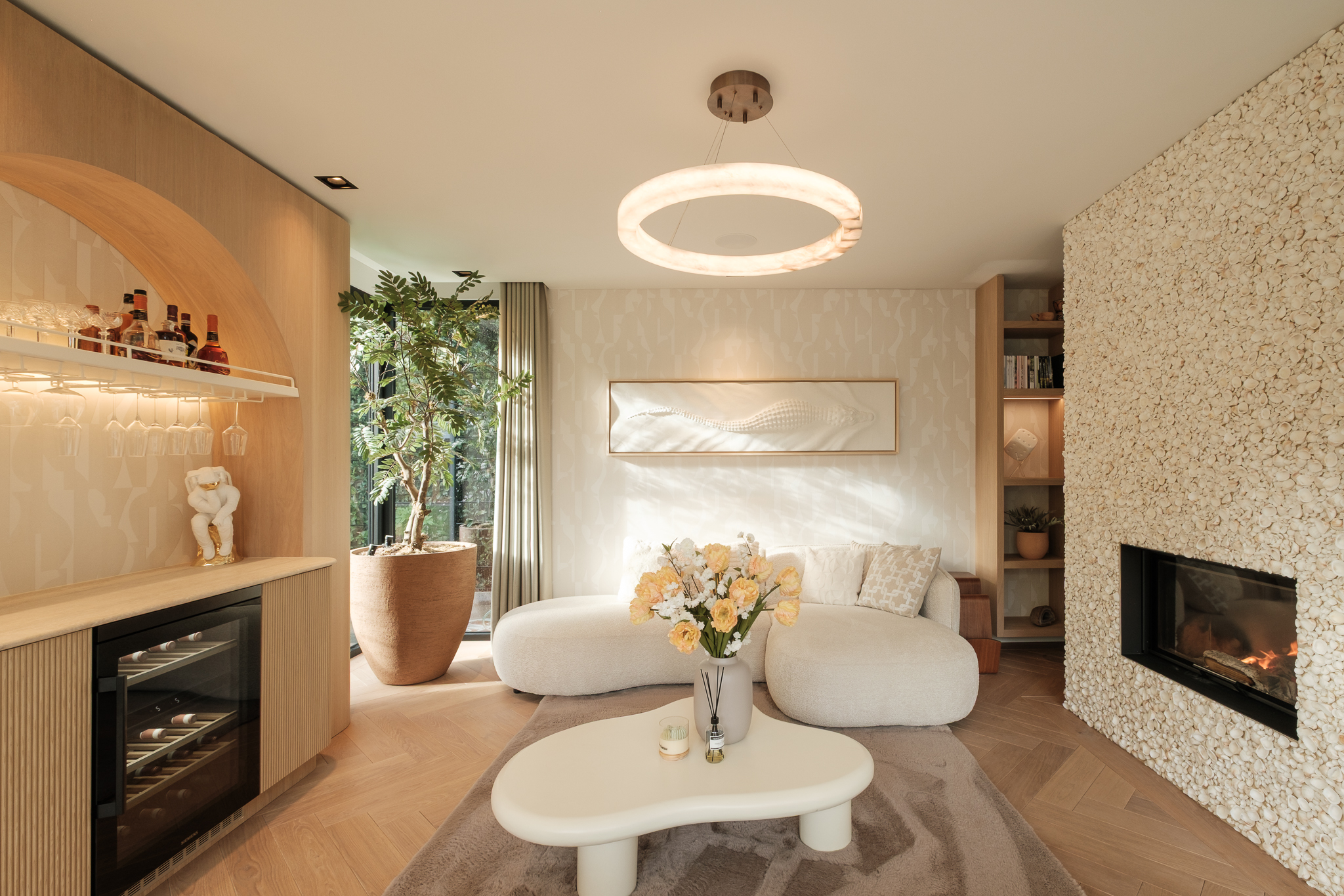 De blikvanger van de ruimte is de indrukwekkende Alabaster ring van Lightinova. Deze Albast lamp verspreidt een zacht en warm licht dat zorgt voor een uitnodigende, luxueuze uitstraling.