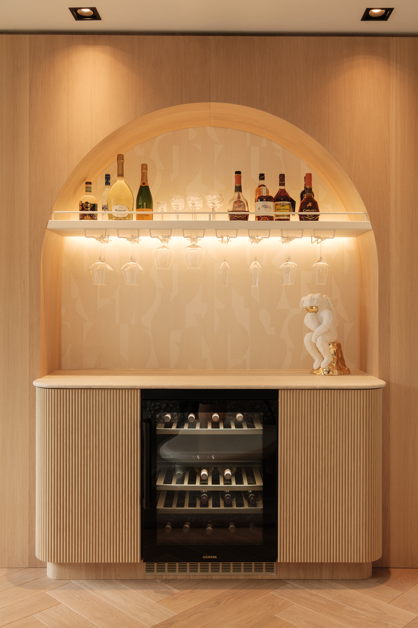 De LED-strips zorgen voor een stijlvolle aanlichting van de flessendisplays en accentueren de unieke materialen in het interieur.