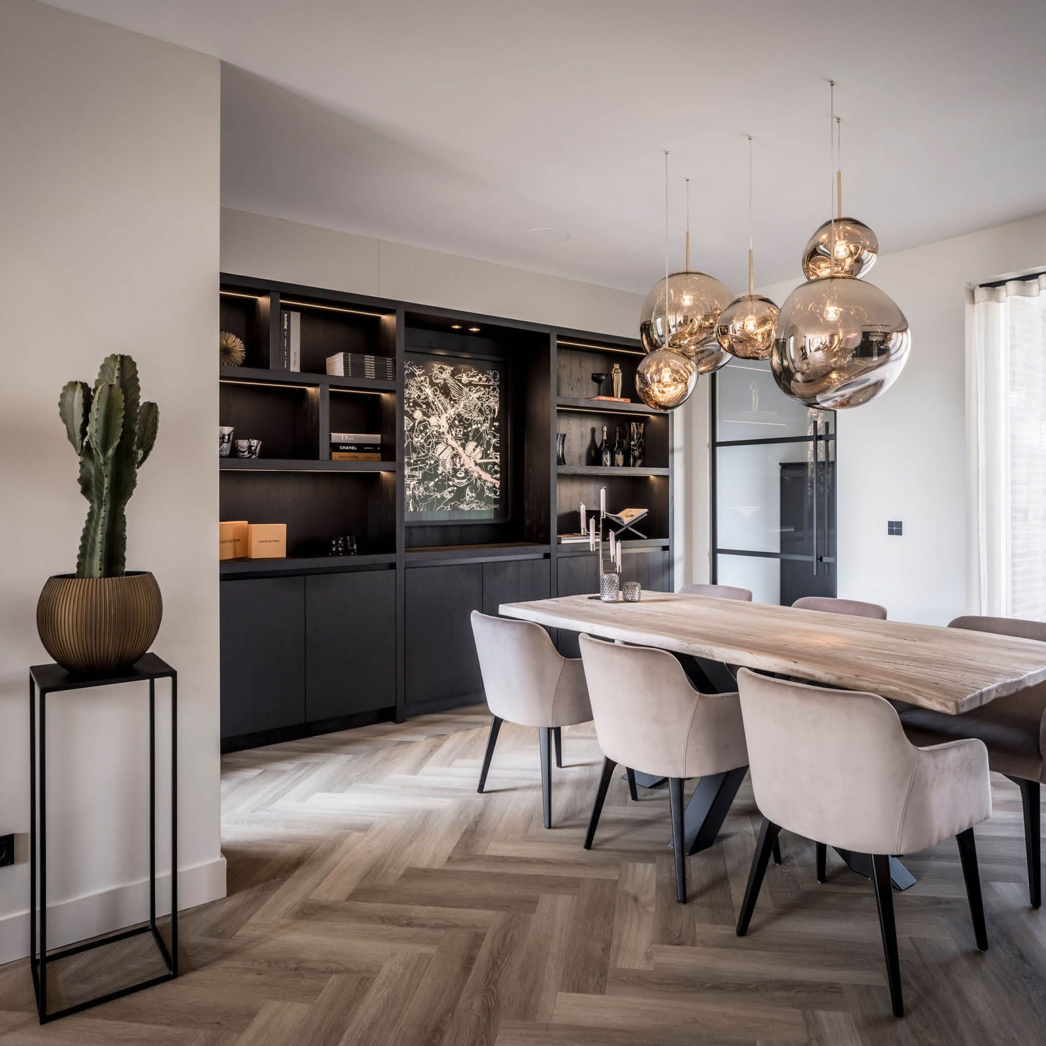 Wie deze recent gebouwde woning binnenstapt, waant zich direct in een vijfsterrenhotel. Het interieur ademt luxe en warmte dankzij de keuze voor onder meer een houten visgraatvloer, een donkerkleurige keuken met marmeren blad en een tv-wand met lederen bekleding.